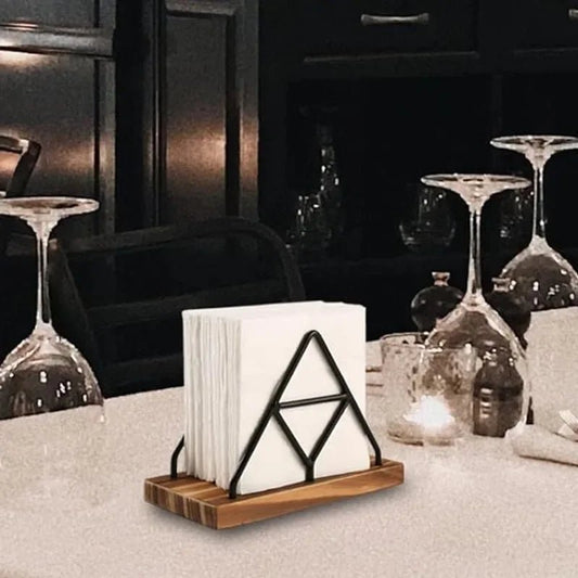 Dreieckiger Serviettenhalter: Freistehender, eleganter Spender aus Holz und Eisen