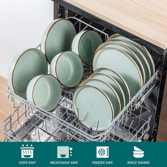 Grünes Keramik-Geschirrset: 16/32-teilig aus ofensicherem Steinzeug mit Teller, Dessertteller & Schüsseln