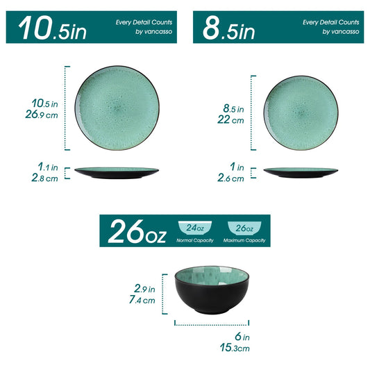 Keramik-Geschirrset: Schwarz-grün mit reaktiver Glasur für Teller, Dessert & Schüsseln