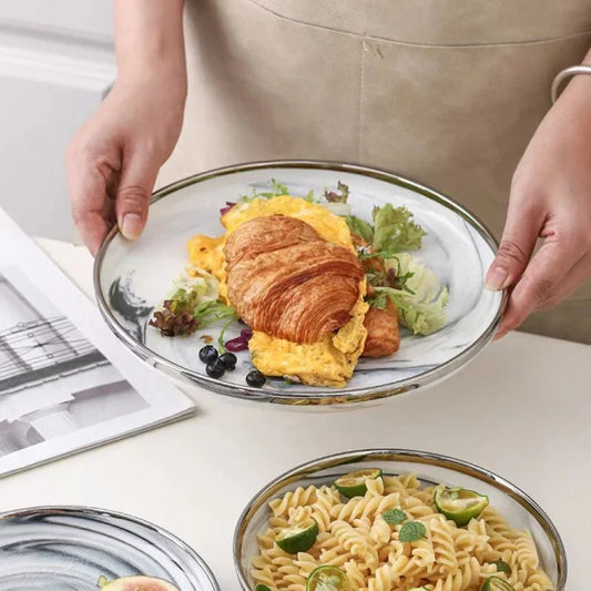 Keramikteller mit Silberrand: Marmor-Design für Steak, Schüsseln & Familien-Dinner