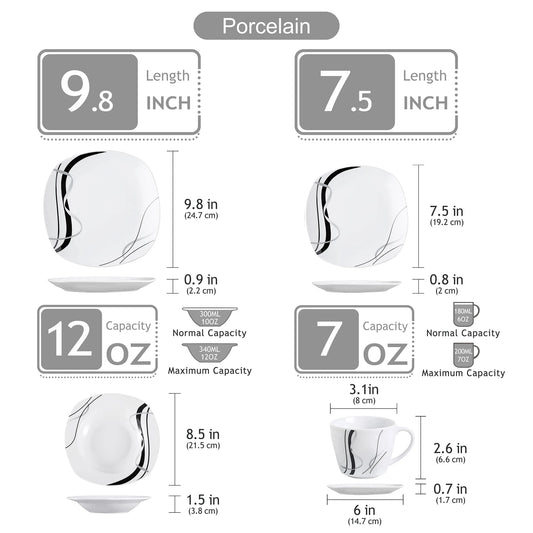 Porzellan-Geschirrset: 30/60-teilig mit schwarzen Linien für Teller, Tassen & Untertassen