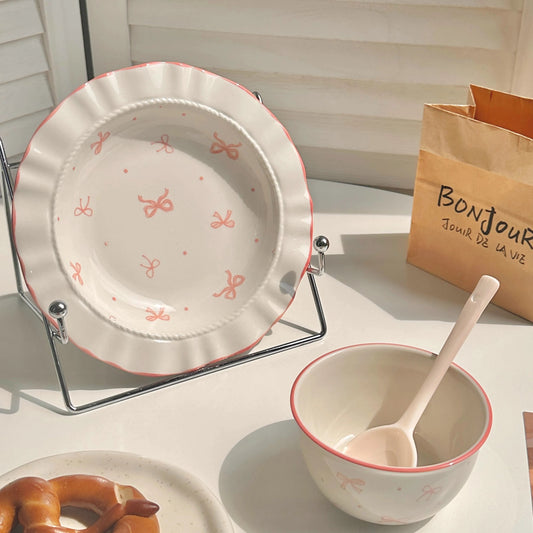 Keramik-Set mit Schleife (6-teilig): Niedliche Schüssel & Teller für den täglichen Gebrauch