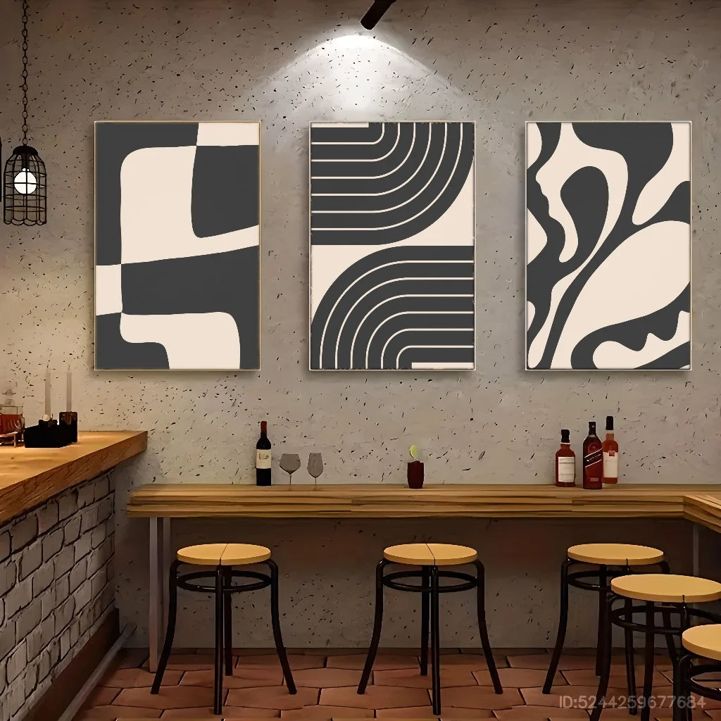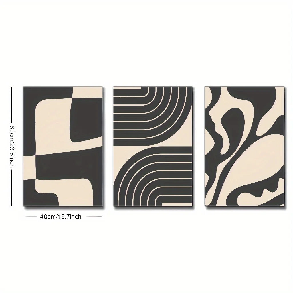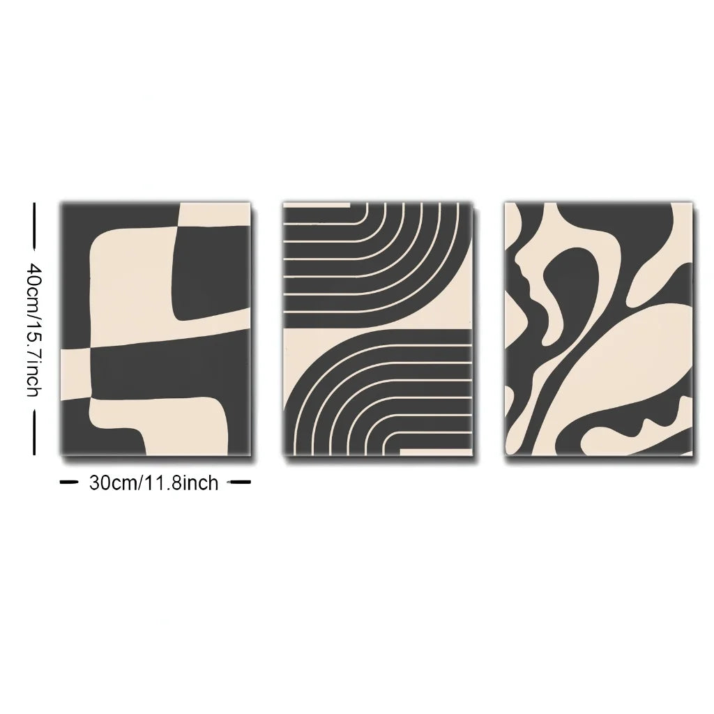 Verleihen Sie Ihren Wänden zeitlose Eleganz und künstlerische Raffinesse. Dieses 3-teilige Set Leinwand-Kunstdrucke ist die perfekte Hommage an den Mid-Century Modern Stil. Die klare Linienführung und die beruhigende Farbpalette aus Schwarz und Beige schaffen eine anspruchsvolle und zugleich minimalistische abstrakte Wandkunst, die jedem Raum sofort Charakter verleiht.