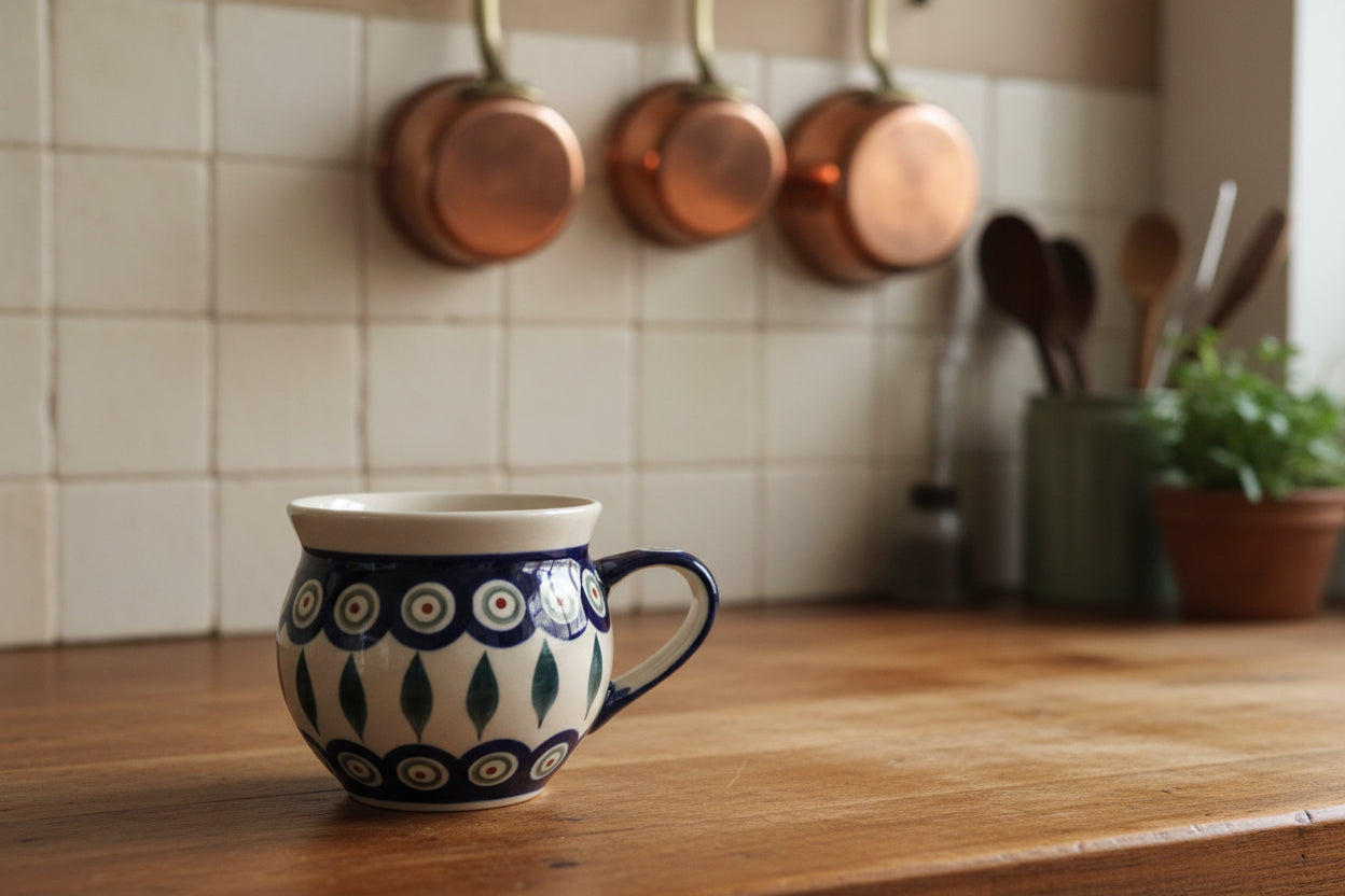 Dies ist die berühmteste Form der Bunzlauer Keramik: der Kugelbecher (auch "Böhmische Tasse" genannt). Mit seiner bauchigen Form ist er nicht nur wunderschön anzusehen, sondern ein echter "Handschmeichler" – er liegt einfach perfekt in der Hand.