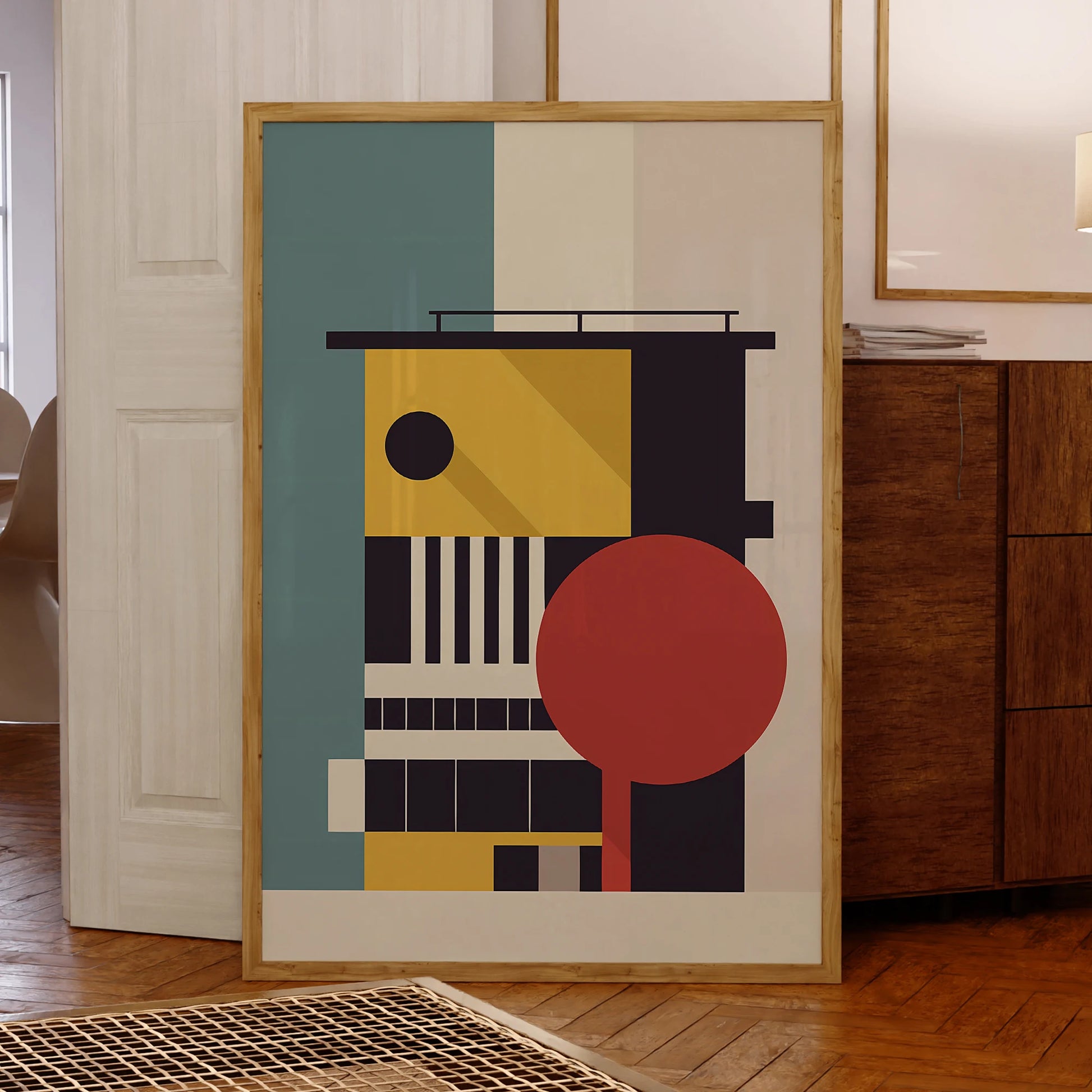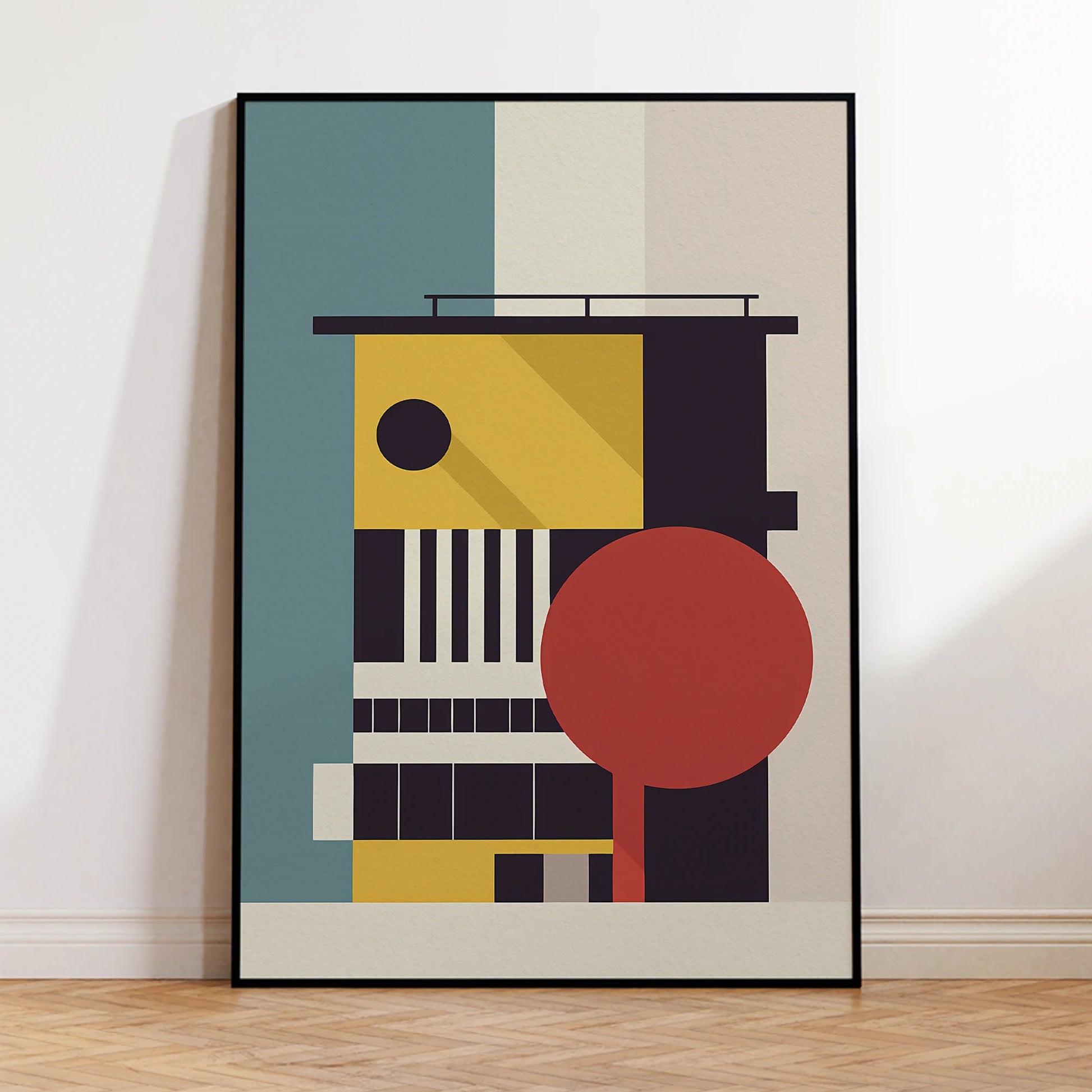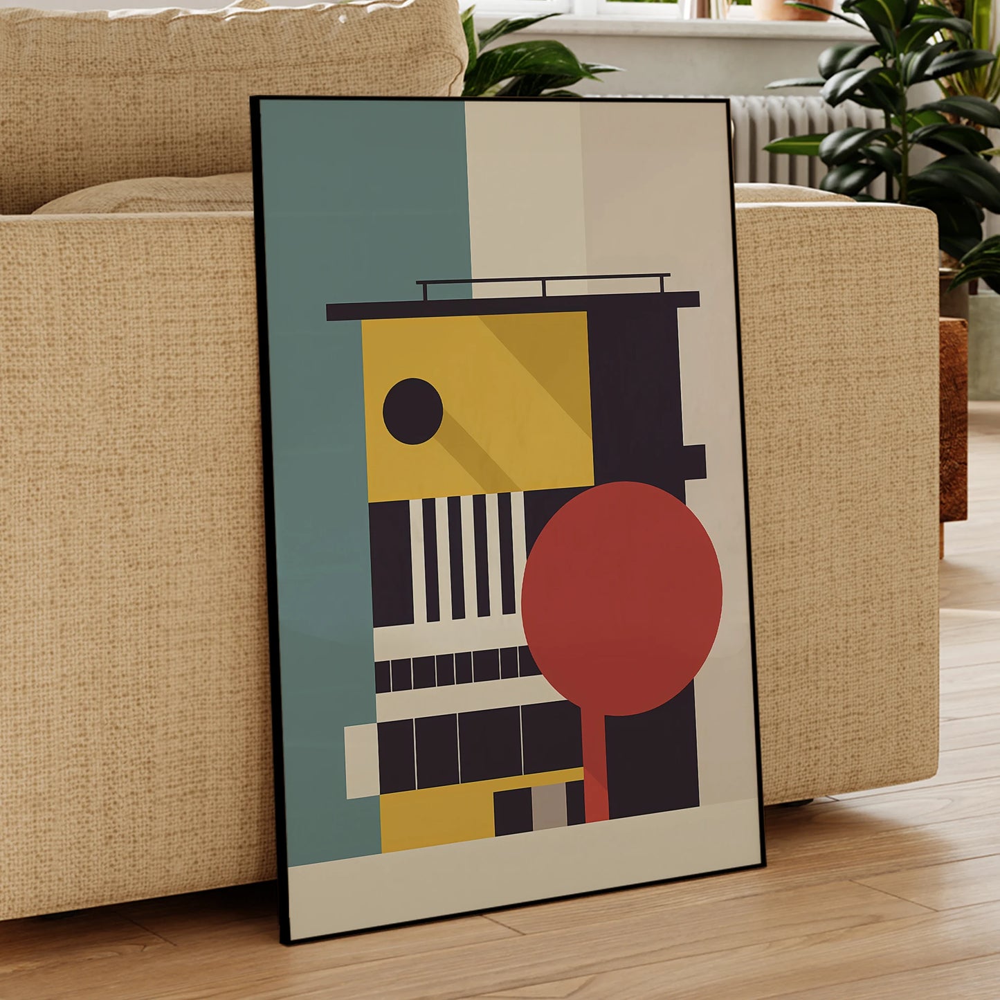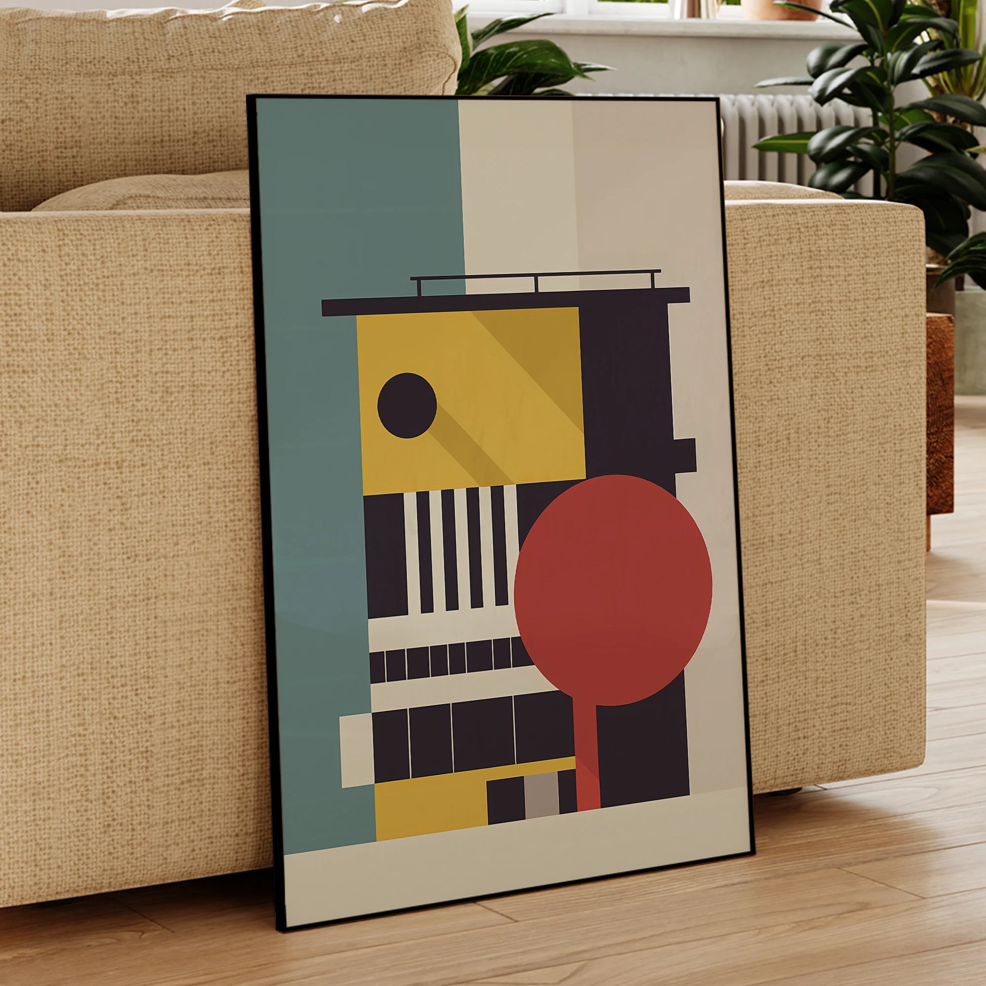 Feiern Sie die zeitlose Eleganz der Moderne! Dieses Leinwand-Poster ist eine Hommage an die Bauhaus-Architektur und die präzise moderne Geometrie. Es ist das perfekte Kunstwerk, um Ihrem Wohnzimmer eine intellektuelle und zugleich stilvolle Note zu verleihen. Die klaren Linien und die abstrakten Formen schaffen eine beruhigende, aufgeräumte Ästhetik.